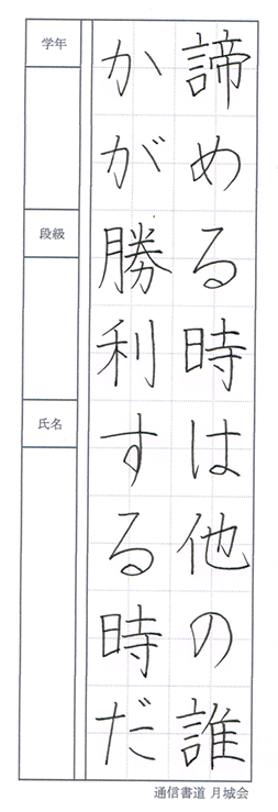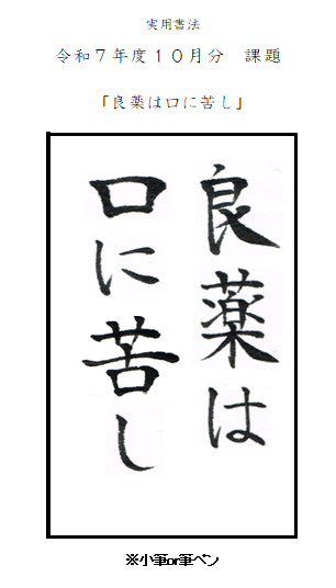 BLOG 月別課題 2025.09.20 《令和7年度10月分 月別課題》 一般楷書「公平無私」 一般行書「公平無私」 一般草書「公平無私」 実用書法「良薬は口に苦し」 ボールペン部「諦める時は他の誰かが勝利をする時だ」 仮名「蝉丸 これやこの 行くも帰るも わかれては 知るもしらぬも あふ坂の関」 中学生1~3年生「出雲の神」 小学5~6年生「北海道」 小学3~4年生「平成」 小学1~2年生「一人」 ブログ一覧