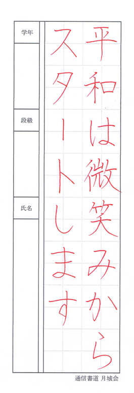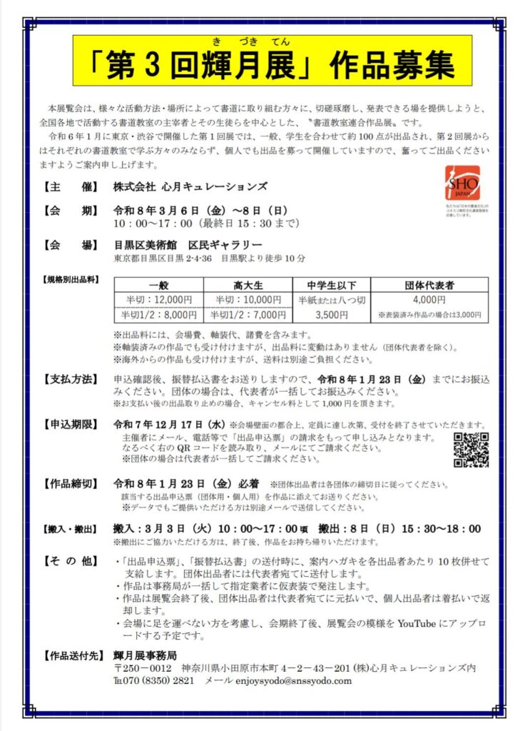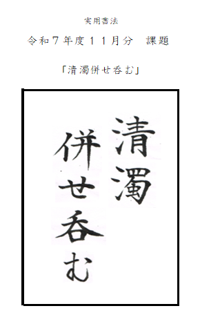 BLOG 月別課題 2025.10.22 《令和7年度11月分 月別課題》 一般楷書「落月屋梁」 一般行書「落月屋梁」 一般草書「落月屋梁」 ボールペン部「平和は微笑みからスタートします」 実用書法「清濁併せ呑む」 小学1~2年生「わた」 小学3~4年生「紅葉」 小学5~6年生「文化の日」 中学生1~3年生「秋の味覚」 展覧会のご案内 受付締切日12月17日、作品締切日1月23日 ブログ一覧