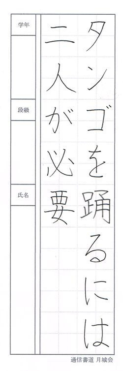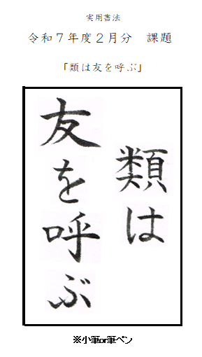 BLOG 月別課題 2026.01.21 【令和7年度2月分 月別課題】 一般楷書「粉骨砕身」 一般行書「粉骨砕身」 一般草書「粉骨砕身」 中学生1~3年生「急先鋒」 小学5~6年生「冷たい風」 小学3~4年生「地球」 小学1~2年生「もち」 ボールペン部「タンゴを踊るには二人が必要」 実用書法「類は友を呼ぶ」 仮名「あまつ風 雲のかよひ路 吹きとぢよ 乙女のすがた しばしとど免舞」 ブログ一覧