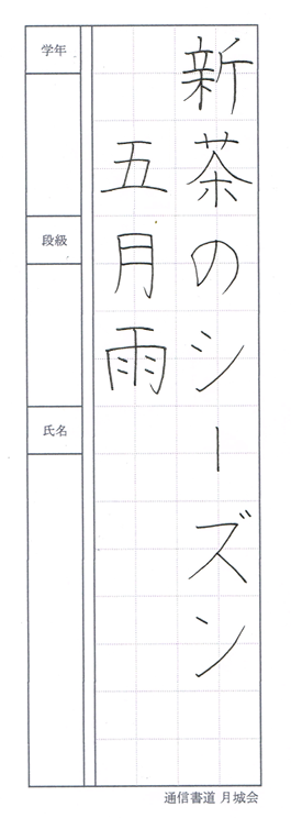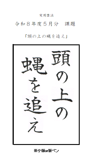 BLOG 月別課題 2026.04.16 《令和8年度5月 月別課題》 一般楷書「移山造海」 一般行書「移山造海」 一般草書「移山造海」 中学生1~3年生「お茶摘み」 小学5~6年生「母の日」 小学3~4年生「青空」 小学1~2年生「あお」 実用書法「頭の上の蝿を追え」 ボールペン部「新茶のシーズン 五月雨」 ブログ一覧